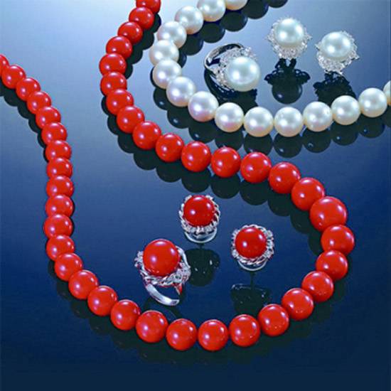 The featured items are 2 sets of pearl jewellery set, sharing the same design and with one in red, and the other in white colour. The set include a pair of earrings, a ring and a necklace, all items are set with round shaped pearls.