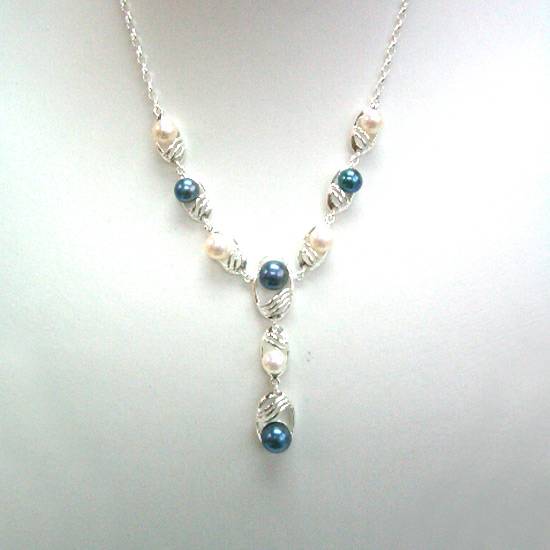 This is a pearl drop necklace. There are nine round black and white pearls in different sizes. The necklace features a cable-link chain with wavy designs. The necklace is adjustable in length.