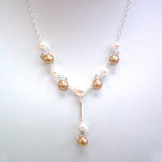 This is a pearl drop necklace. There are eleven round golden and white pearls in different sizes. The necklace features a cable-link chain with wavy designs. The necklace is adjustable in length.
