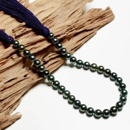 This necklace is made of dark green pearls. The necklace is formed by a bundle of purple strings, which created a different style from other pearl necklaces. The pearls are uniform, meaning that they are all in the same size. It matches perfectly with night gowns of similar colour.