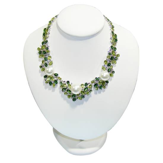 The pearl necklace is made in 900 platinum with 3 South Sea pearls. The round pearls are in the size of 16mm with flawless appearances. The necklace also have tourmaline stones as embellishments in light and dark colors for contrast effect.