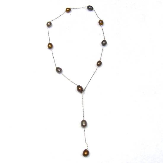 The featuring jewellery is a pearl drop necklace for ladies and women. There are a total of eleven pearls in round and oval shape being strung along the chain, showing a simple yet fashionable style.