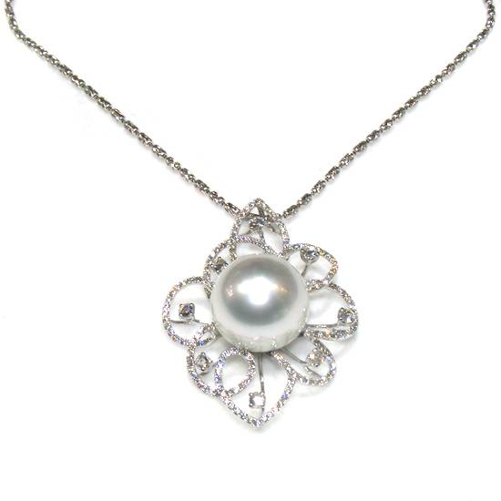 This is a pearl necklace in flower shape. The pendant is made into a flower shape with a pearl in the middle. The side of the flower petal is decorated with diamond. These are ideal for women in any formal occasions.