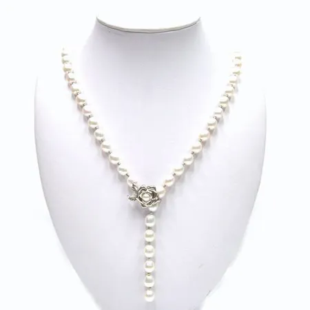 Featured is a necklace made with cultured fresh water pearls. It flaunts an elegant style with a silver rose as decoration. This pearl necklace is suitable for ladies of all ages.