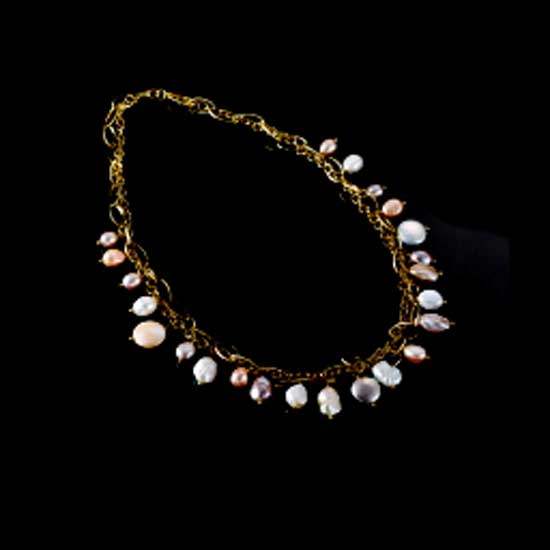 Displayed here is a ladies' necklace completed with a chain of intertwining golden rings. Granular-shaped and disc-shaped pearls dangle on the golden-ring chain . The pearls catch your eyes with diverse colors and sleek surfaces.