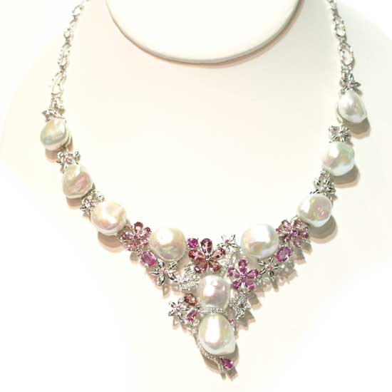 This is a pearl necklace with the theme of a boutique ring to boost a unique touch. The handcrafted flowers are made of pink sapphire and loose diamonds. This pearl necklace is the ideal piece to adorn your evening dresses.