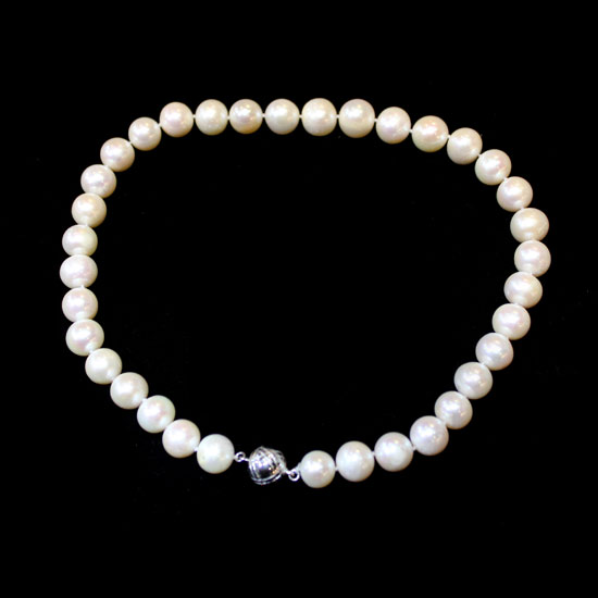 The charming pearl necklace is made with quality round white pearls. All the natural pearls shimmer with a smooth lustrous finish. The strand is secured with a 18K gold round clasp.