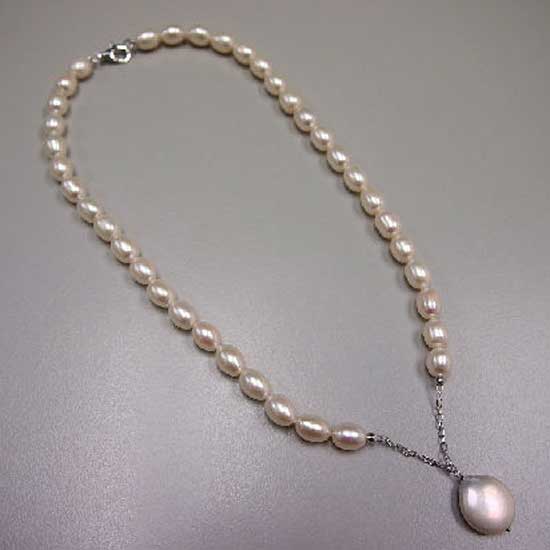 This beautiful necklace strand features 7-8mm white rice pearls accented with a coin pearl pendant. This elegant necklace secures with a silvery-tone lobster claw clasp. The eye-catching pink tone of this pearl necklace adds a romantic touch to its appearance.