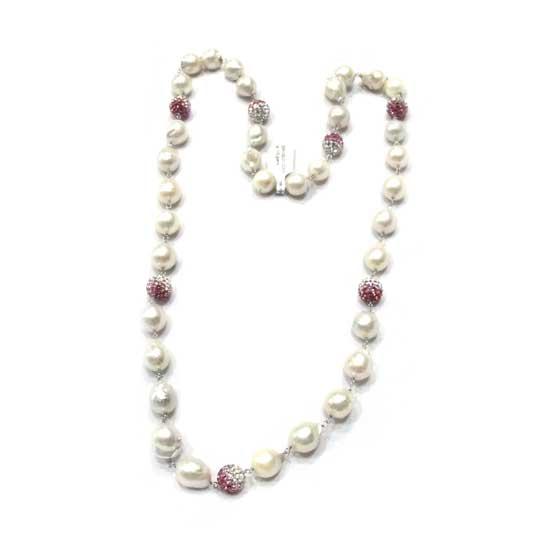 This stylish necklace consists of white freshwater pearls that boast high luster and smooth surfaces. The red stones are accented with dazzling CZ stones for a striking effect. Finely crafted of silver, this pearl necklace is an ideal addition to complete your jewelry box.