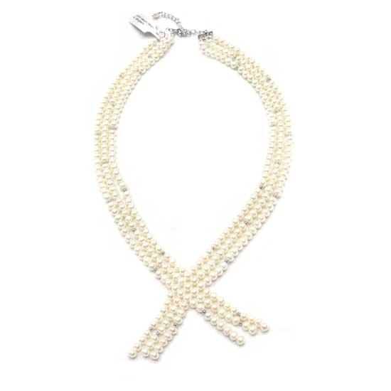 This elegant necklace is made of three rows of freshwater pearls that boasts maximum luster. Finely crafted of silver, this necklace boasts a simple yet luxurious touch. This stylish necklace is easy to mix and match with your fashion wear for a trendy look.