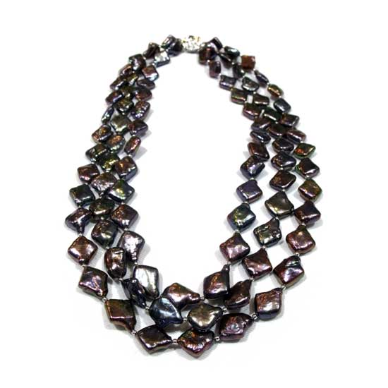 This fashionable pearl necklace features three strands of black Keshi pearls in square shapes. The fresh water Keshi pearls shimmers with beautiful luster. The necklace clasp is made of 925 sterling silver.