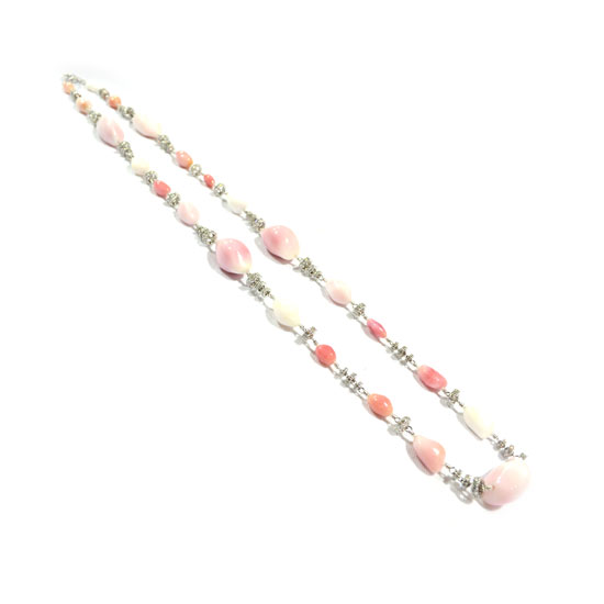 This pearl necklace comes with a strand of couch pearls embellished by loose diamonds. The pearls are finely polished to diffuse a light pink hue. It is a fabulous piece of jewelry to complete your elegant outfit.