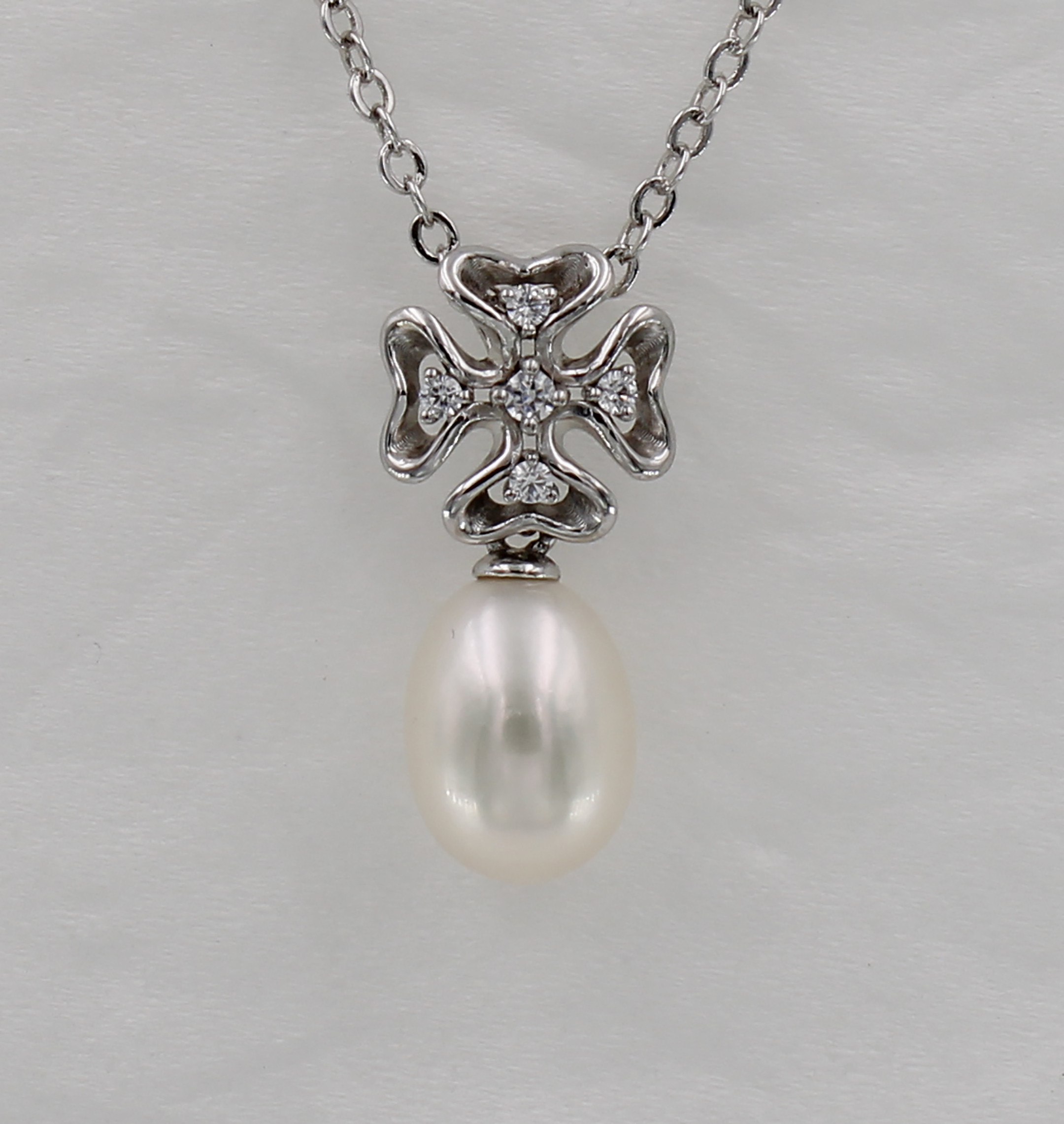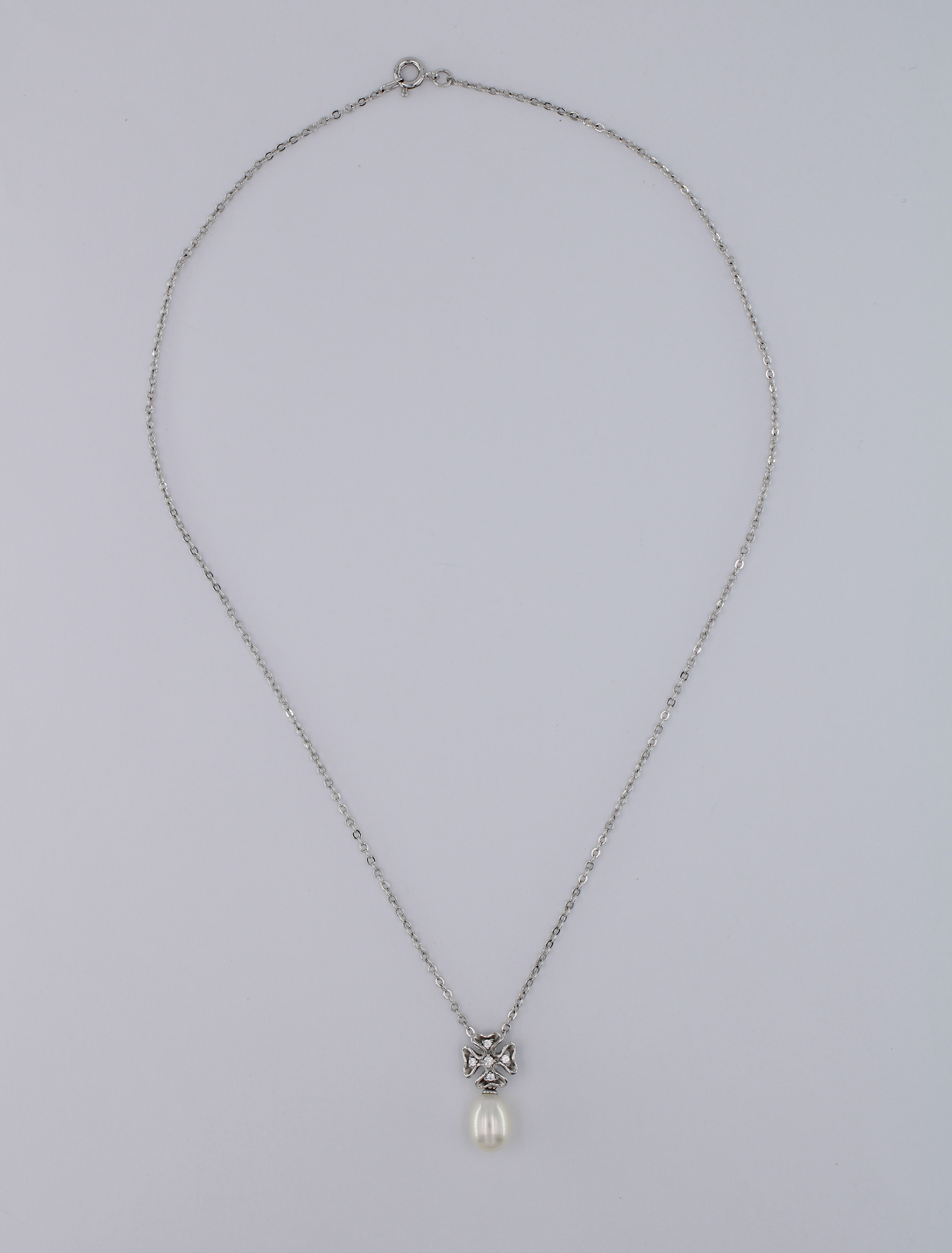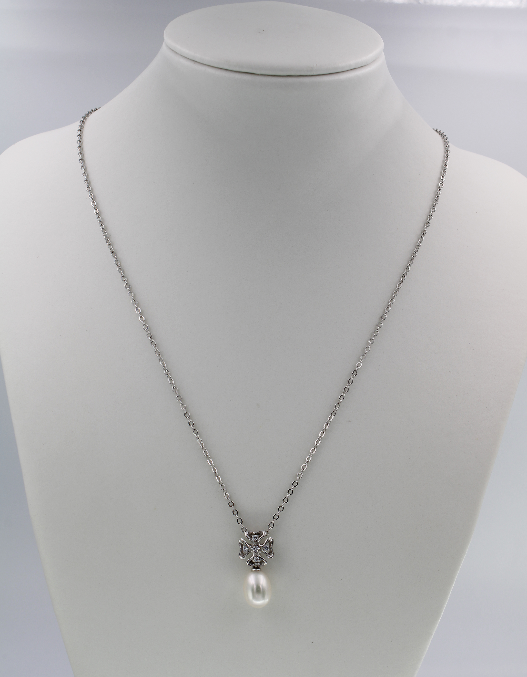 10 mm flower shape with CZ Pendant, hanging 1 pc. of F.W.Pearl 7.5-8.0 mm drop shape in white, all metal are 925 sterling silver in rhodium plated, free of nickel.