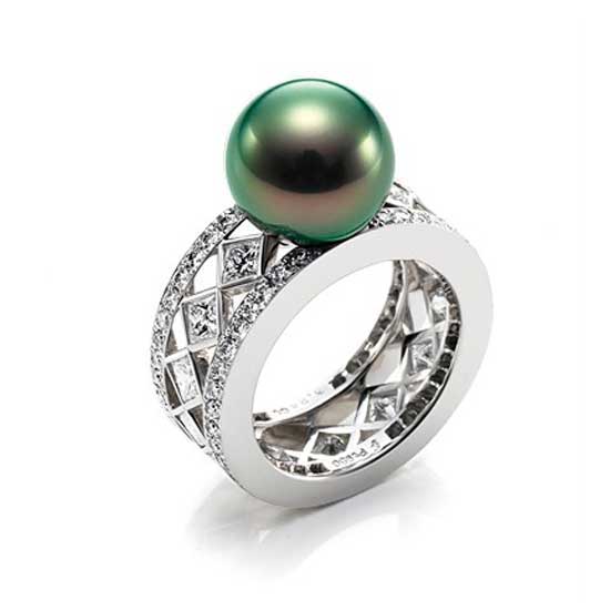 This dainty pearl ring features a thick band with rhombus-shaped cut-out patterns. The band is embedded with tiny glittering stones. The lustrous pearl shines in a miraculous green shade. Dress up yourself for a special evening with this luxurious pearl ring.