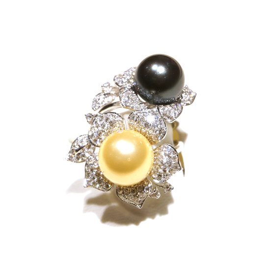 This is a charming finger ring that features two large pearls in black and gold. The allover dazzling diamonds are well mounted on the white gold floral setting. This finger ring shimmers with a high-gloss finish.