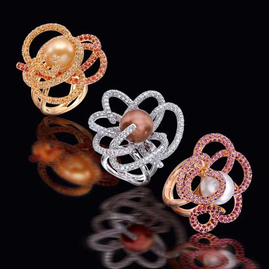 This fascinating collection of rings features openwork designs in intriguing twists. Cradling a golden, coffee or off-white pearl at the center, the rings simply look stunning. White and red gold are used in the design too.