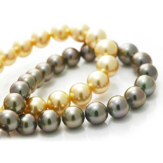 Displayed is a pearl strand that is available in two colors. Made of Tahiti pearls, the black one has a charming metallic luster. The golden one is made of high quality South Sea pearls. These round pearls are great for making fine jewelry.