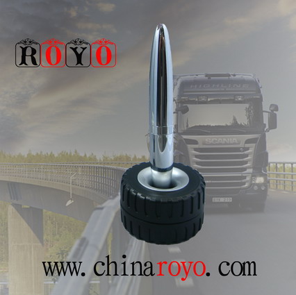 Keep your pen upright on your tabletop by using this pen holder set. The metal ball pen is matched with a holder contouring to a tyre for a funny and eye-catching look.