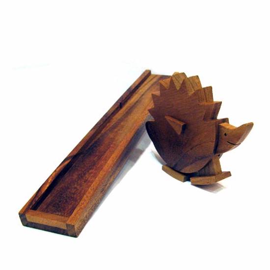 This product is a pen rack for any tabletop surface. The set includes one cuboid rack and a hedgehog shaped standing rack. Both pieces are made from high quality wood treated with a glossy finish.