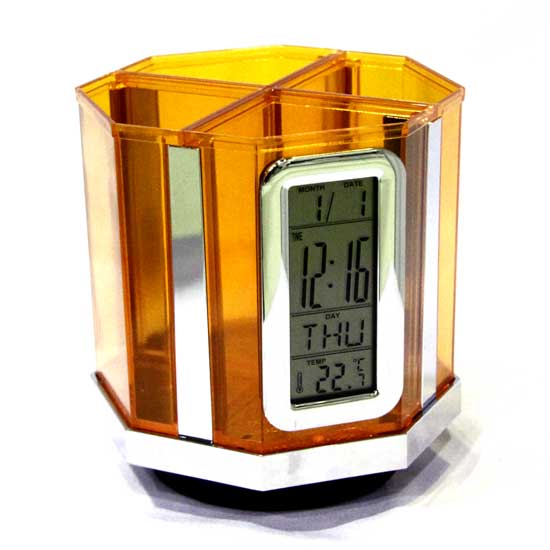The displayed pen stand clock is a highly functional item. The stand comes with four partitions for holding different stationery items. The exterior features a digital clock that tells the time, date and temperature.