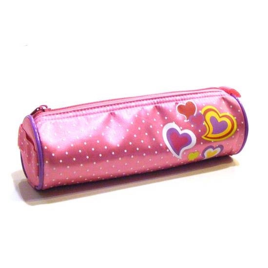 The featured item is a pencil bag in girlish and trendy style. It is pink in colour with white polka-dotted patterns. It is also highlighted with several heart patterns at the side.