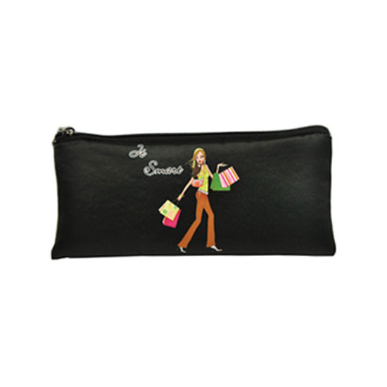 This pencil bag comes with a black finish, printed with a fashionable lady carrying colorful shopping bags. It provides ample space to hold your stationery. It features a zip-up closure for added security.