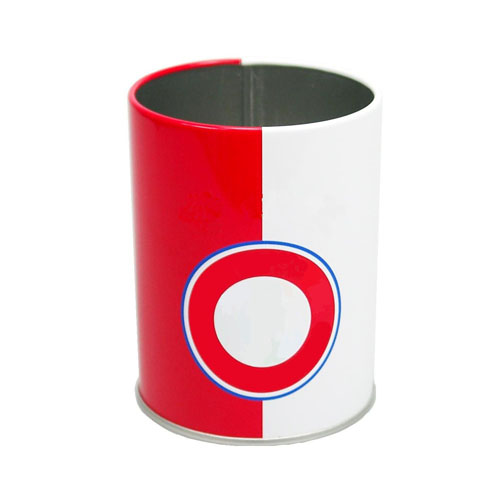 This pencil holder is made of tin material and printed with red and white to show off a contrasting design. The tin pencil holder is in a canister shape, which allows you to put your stationery in it and organize them tidily.