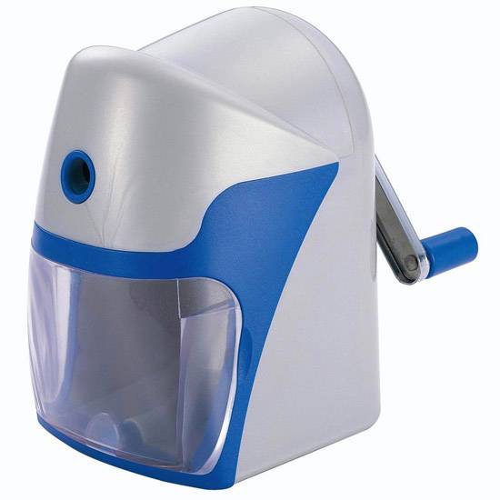 The manual pencil sharpener features a plastic body in a stylish design. It comes with a rotary handle. This traditional pencil sharpener is essential for every home and office.