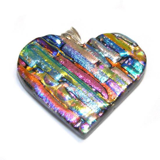 This heart-shaped pendant features a colourful image. Made of dichroic glass, the heart is divided into many diagonal rows of different colours. The surfaces of the rows seem to be rough, making the surface of the pendant irregular. The pendant is so colourful that may make everyone seeing it feel energized and pleased.