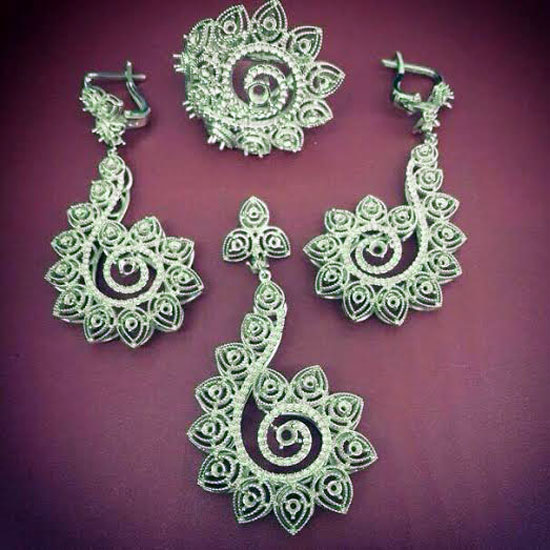 This jewelry set of pendant, earrings and ring is exceptionally spectacular with the elaborate carving. Each piece is further adorned by delicately mounted stones for a gorgeous touch. The flamboyant design can wonderfully showcase your unique taste.