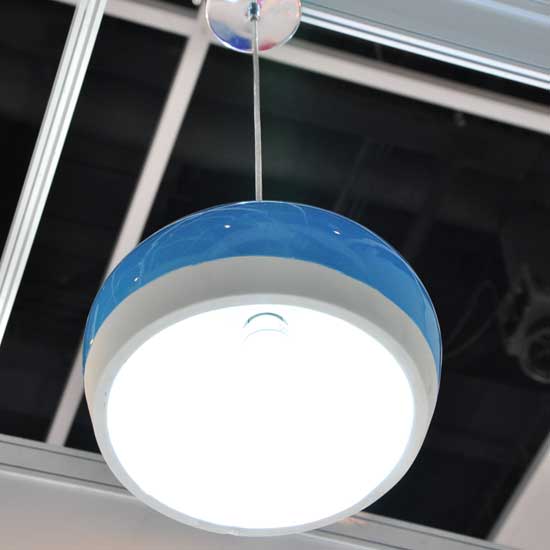 This round pendant lamp features a two-tone design in blue and white. It is suitable for use in the dining room or the sitting room. Designs in other colors are also available.