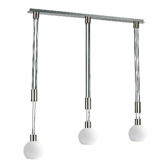 This is a pendant light with a contemporary and modern design. It features a durable metal structure with a nickel coating and three heads with global lampshades in white. The LED light source offers even and stable brightness with low energy consumption.