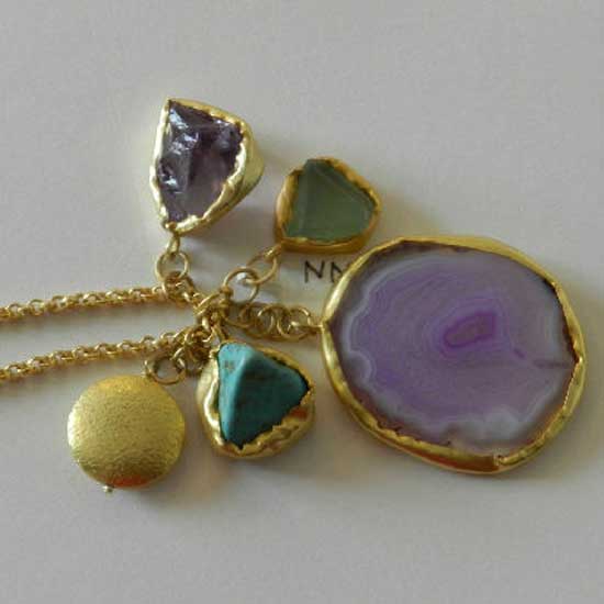 This deluxe ladies’ necklace is skillfully linked by a chain of small gold-tone rings. The gorgeous necklace flaunts alluring pendants of different sizes, which are delicately crafted from colorful semi-precious stones such as the agate and aquamarine. The gold-tone mountings for the stones inject exquisite flair into the entire appearance.