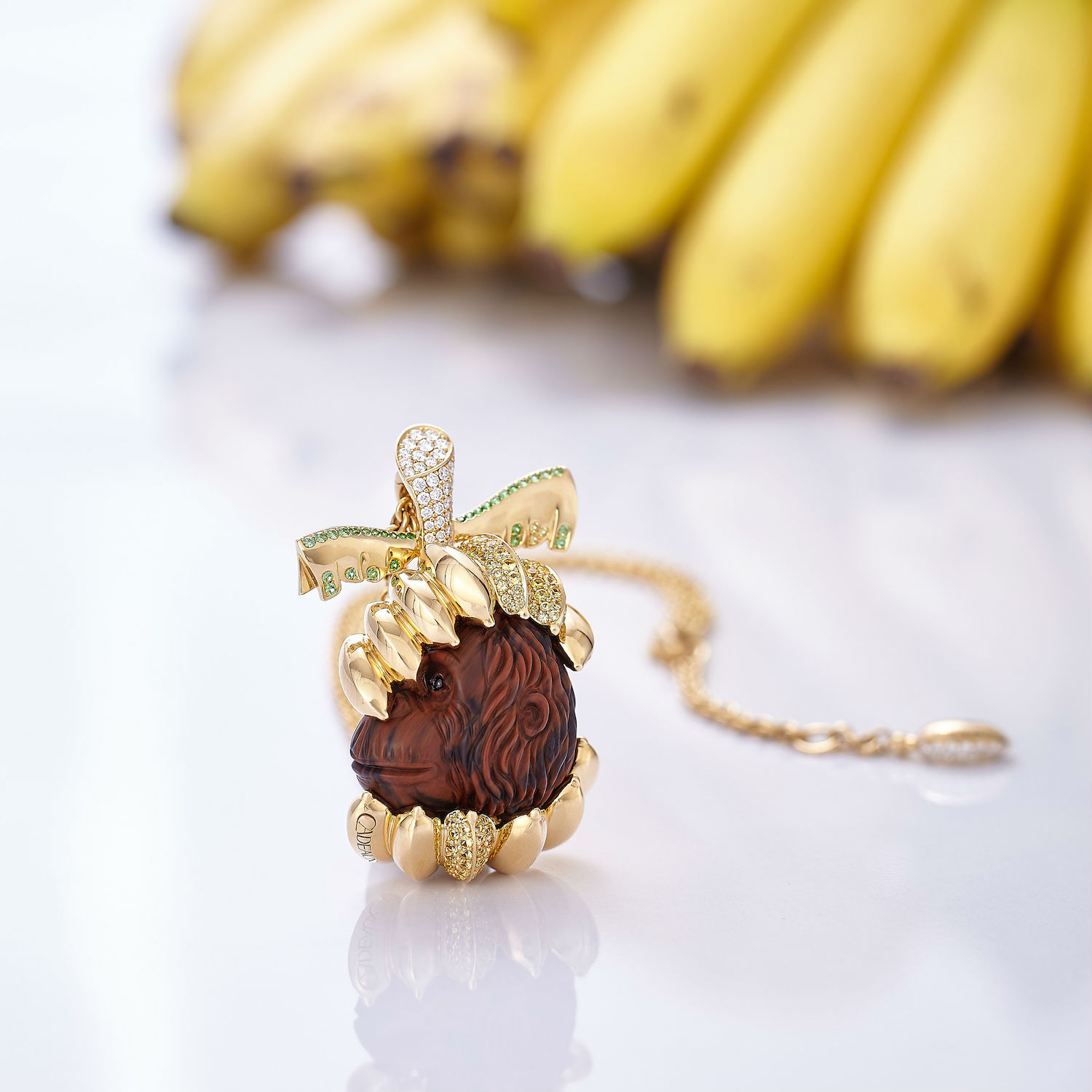 Pendant Orangutan, created in 2017 by Tevin Baechtold. The hand carved mahogany obsidian in shape of a Orangutan head is set in a 18 Karat yellow gold mounting in the shape of a bunch of bananas, set with Tsavorites, yellow Sapphires and Diamonds. Including a 50 cm handmade 18 Karat yellow gold chain.
