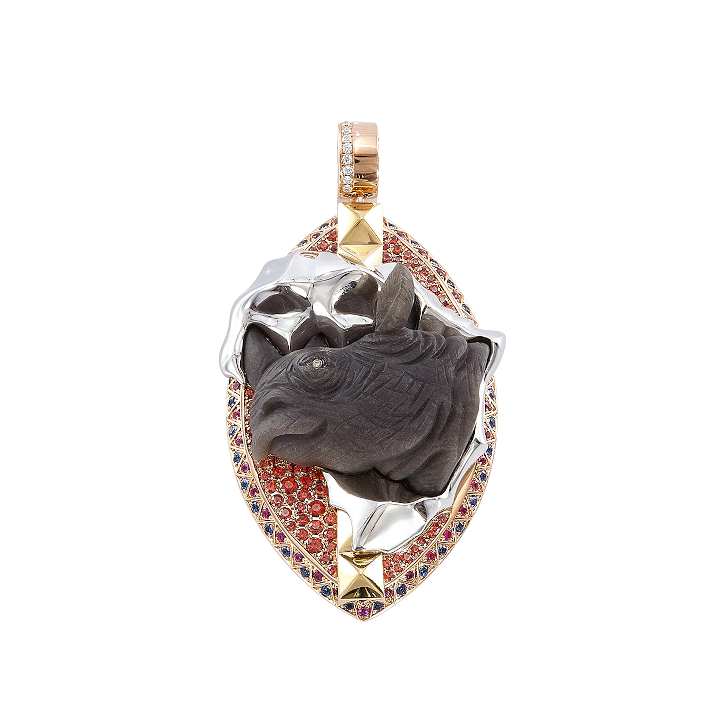 Pendant Warrior Rhino, created in 2017 by Tevin Baechtold is a tribute to a very powerful, but currently rare species on our planet. A life-like hand carved grey obsidian in the shape of a African Rhino is set in to a 18 Karat yellow gold mounting in the shape of a masai tribal warrior shield, set with Sapphires, Rubies and diamonds.