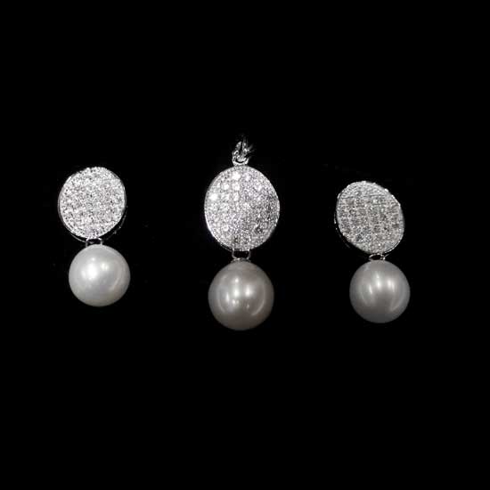 This pendant and pair of earrings feature a glittering round silver plate with a draping pearl. The sophisticated craftsmanship offers them a glossy appearance. This dainty pendant and pair of earrings are an attractive addition to your jewelry box.