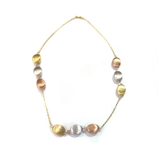 This necklace has three sets of golds of different colours. Each set features three pieces, in golden, silver and brown colours respectively. They are orderly placed along the chain, creating a sense of balance. Their colours make them resemble Easter eggs, which relate the necklace with happiness and joy.