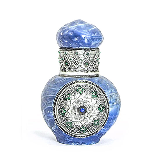 This is a perfume bottle that comes in an elegant style. The light blue body is embellished with polyresin decorative patterns. A glass rod is included for convenient usage.