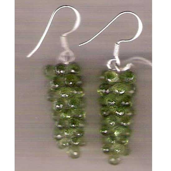 Available are peridot earrings featuring an engaging grape design in green. Each grape reflects arresting brilliance from its multiple facets. This pair of earrings can go with or without silver hooks.