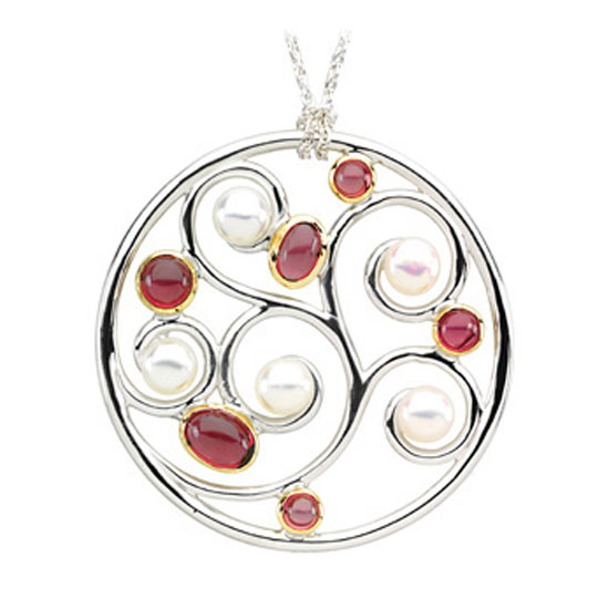 The peridot pendant comes in a neat circular shape. It is crafted with a swirly design trimmed with peridot and garnet stones. The luxurious 18k gold construction makes it a highly-treasured collection.