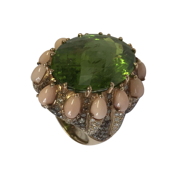 • Cocktail ring in 18 kt rose gold, with peridot ct 33,46 brown and white diamonds and coral "peau d'ange" pears