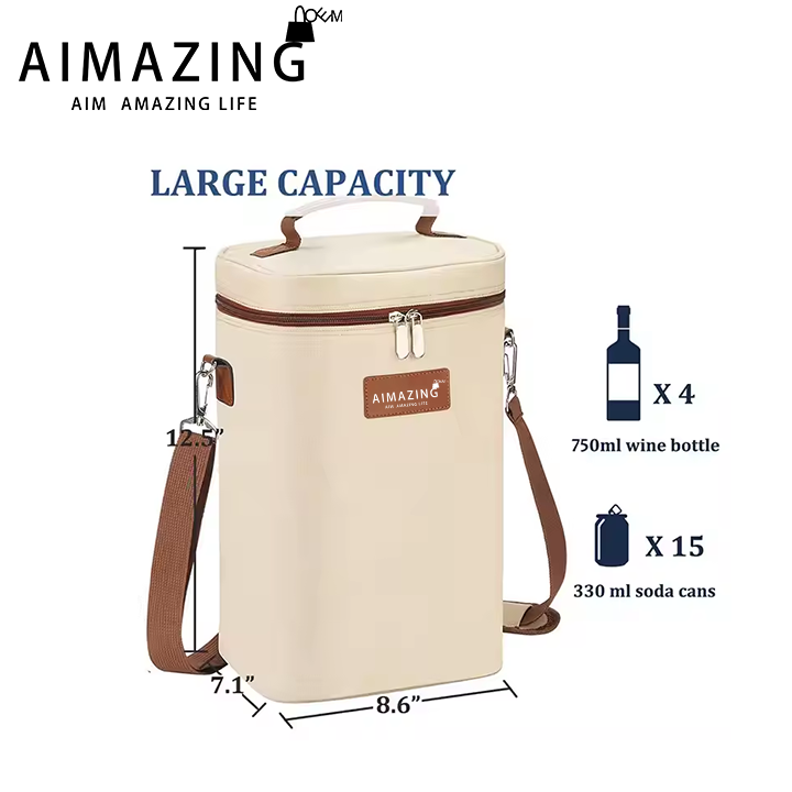 Aimazing's wine cooler bag is engineered to have an ample capacity, perfectly catering to the needs of wine enthusiasts. Standing at 12.5" in height, 7.1" in width, and 8.6" in depth, it can snugly hold up to 4 bottles of 750ml wine. Whether you're packing for a picnic with a picnic wine bag, a party, or a romantic outdoor dinner, this bag offers enough space. It can also carry 15 cans of 330ml soda, making it a practical wine tote bag. The roomy interior facilitates effortless packing and organization, suitable for any occasion.