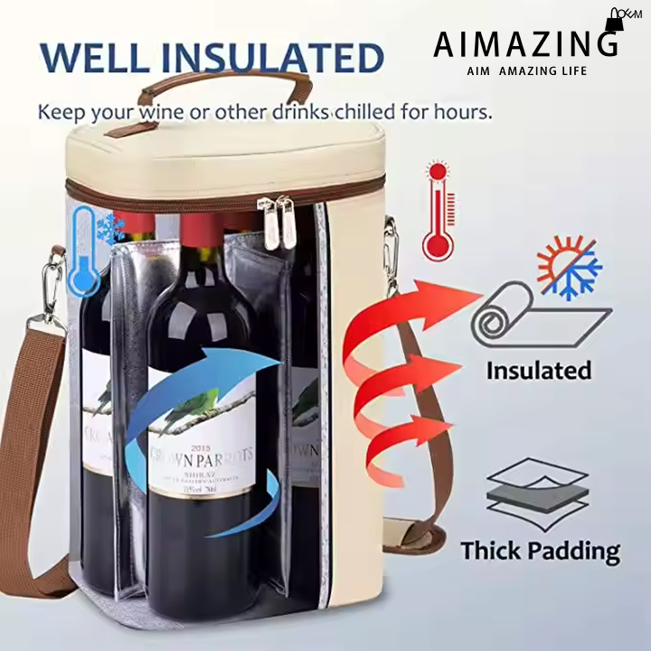 1.Spacious Aimazing wine cooler bag, insulated to perfection. Carry 4 wine bottles. Ideal for picnics, parties, and travel. Dual zippers, removable divider, and convenient straps make it a must-have for wine lovers. Effortlessly transport your favorite wines while keeping them at the perfect temperature.