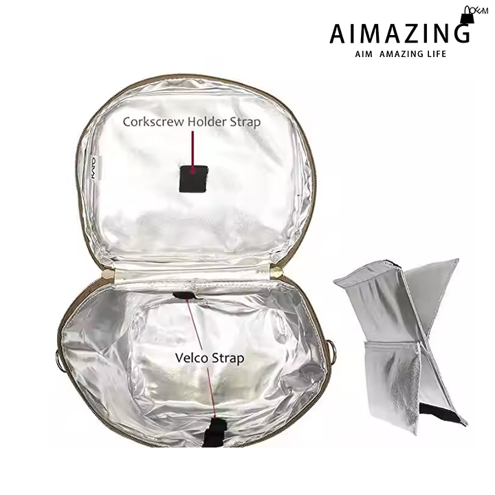 2.Discover our customizable Aimazing wine cooler bag! Engineered with thick insulation to maintain wine's quality. Features like a corkscrew holder and Velcro strap keep things organized. Whether for a romantic dinner or wine tasting event, it's your reliable wine companion, combining functionality and style seamlessly.