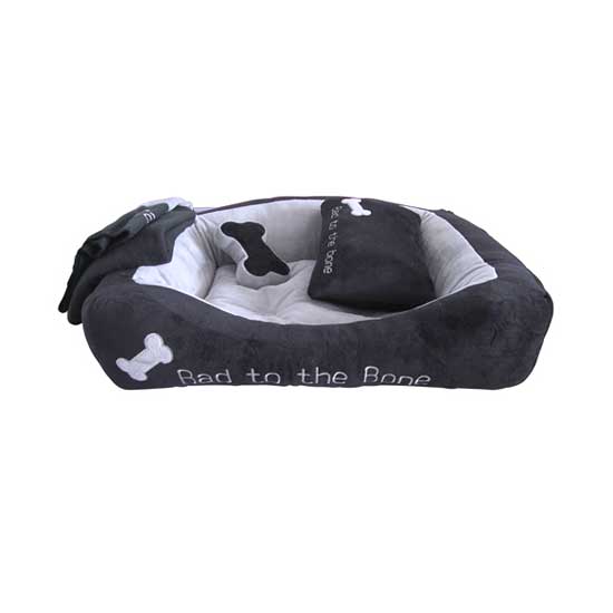 This pet bed set comes with a black finish. It includes a pet bed, a pet pillow, a pet quilt and a bone-shaped stuffed toy. The pet bed offers a comfortable place for your pet to sleep.