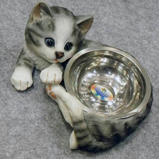 This adorable container is well-designed for pets. It features an imitation of a cat lying on the floor. The polished stainless steel bowl is perfect for storing pet food. The sturdy materials offer reliable durability for long-time use.