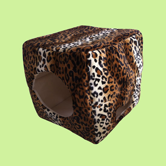 This is a pet house with a leopard print pattern in a cube shape. The pet house comes with soft padded walls for added safety. It is perfect as a protective shelter for your cat or dog.