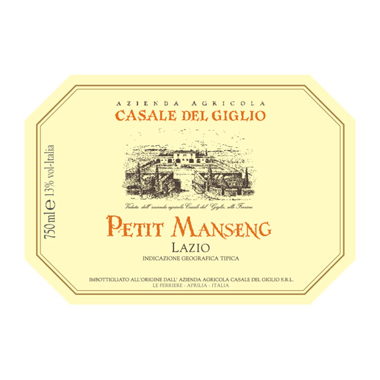 This Petit Manseng Lazio IGT 2010 uses the optimal acidity of 100% fully ripe Petit Manseng grapes, which guarantees the varietal character of this aromatic white wine. After crushing, the grapes are chilled to 7-8˚C and allowed to macerate at this temperature for 10-12 hours. They are then slowly and gently soft-pressed to avoid damaging the skins and sedimentation takes place naturally at 14-16˚C. The spontaneous fermentation enhances the aromatic characteristics of the variety, and yeasts are not added until the second day.