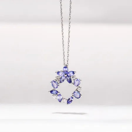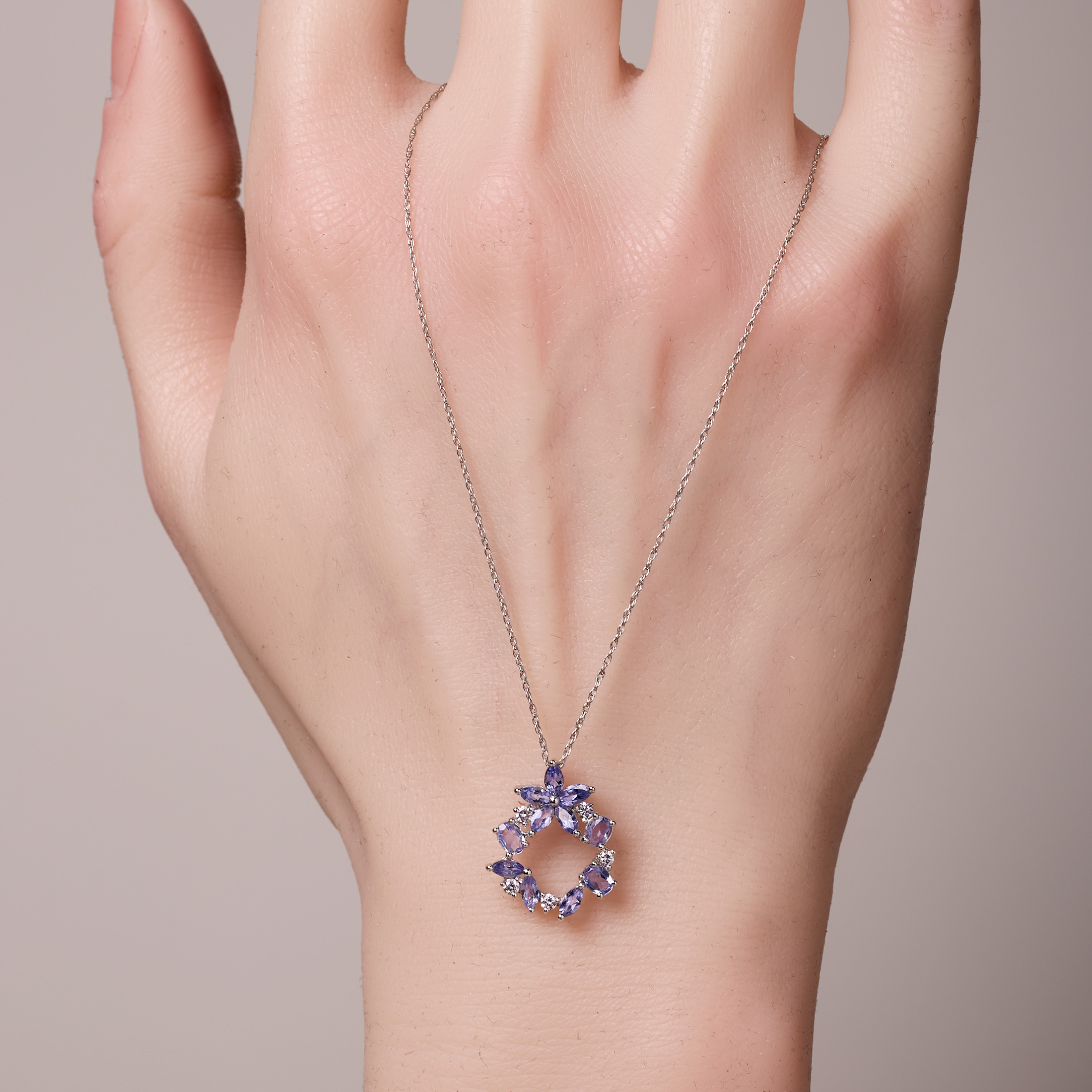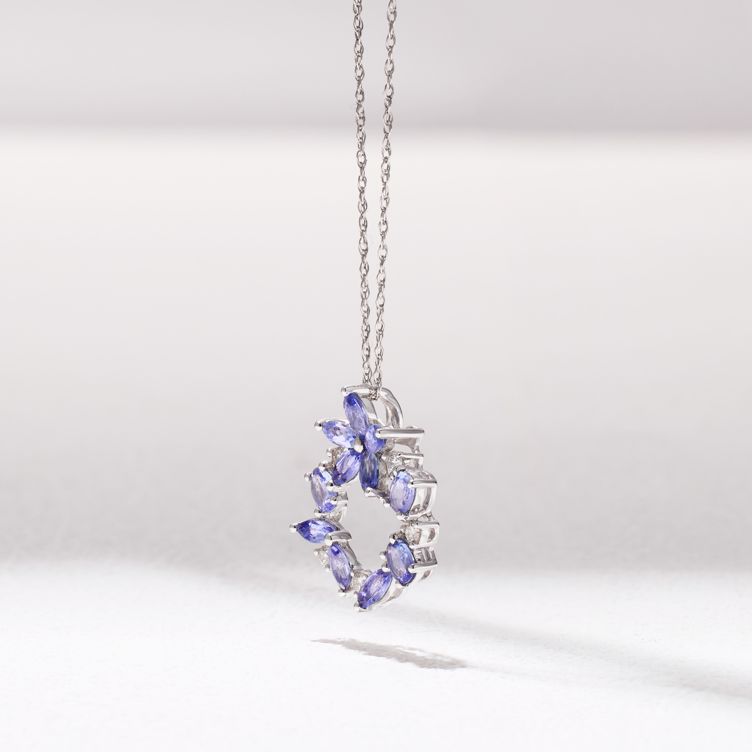 This pendant is the perfect combination of romantic and nature-inspired design, adding a touch of sophistication to any outfit. It is crafted in 18K white gold and features a wreath-like style with marquise-cut tanzanite leaf shapes along a round-shaped outline. The small round diamonds outlining each leaf create an eye-catching effect, further enhancing the pendant's overall look.