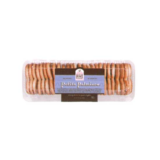 This is a box of petite palmiers packaged in a rectangular clear box. The centuries-old French recipe with over three hundred layers of dough and 100% butter, making each bite of these signature petite palmiers irresistibly flaky. The petite palmier is an enticing and unique cookie that is even better with ice cream, whipped cream or just a touch of honey.
